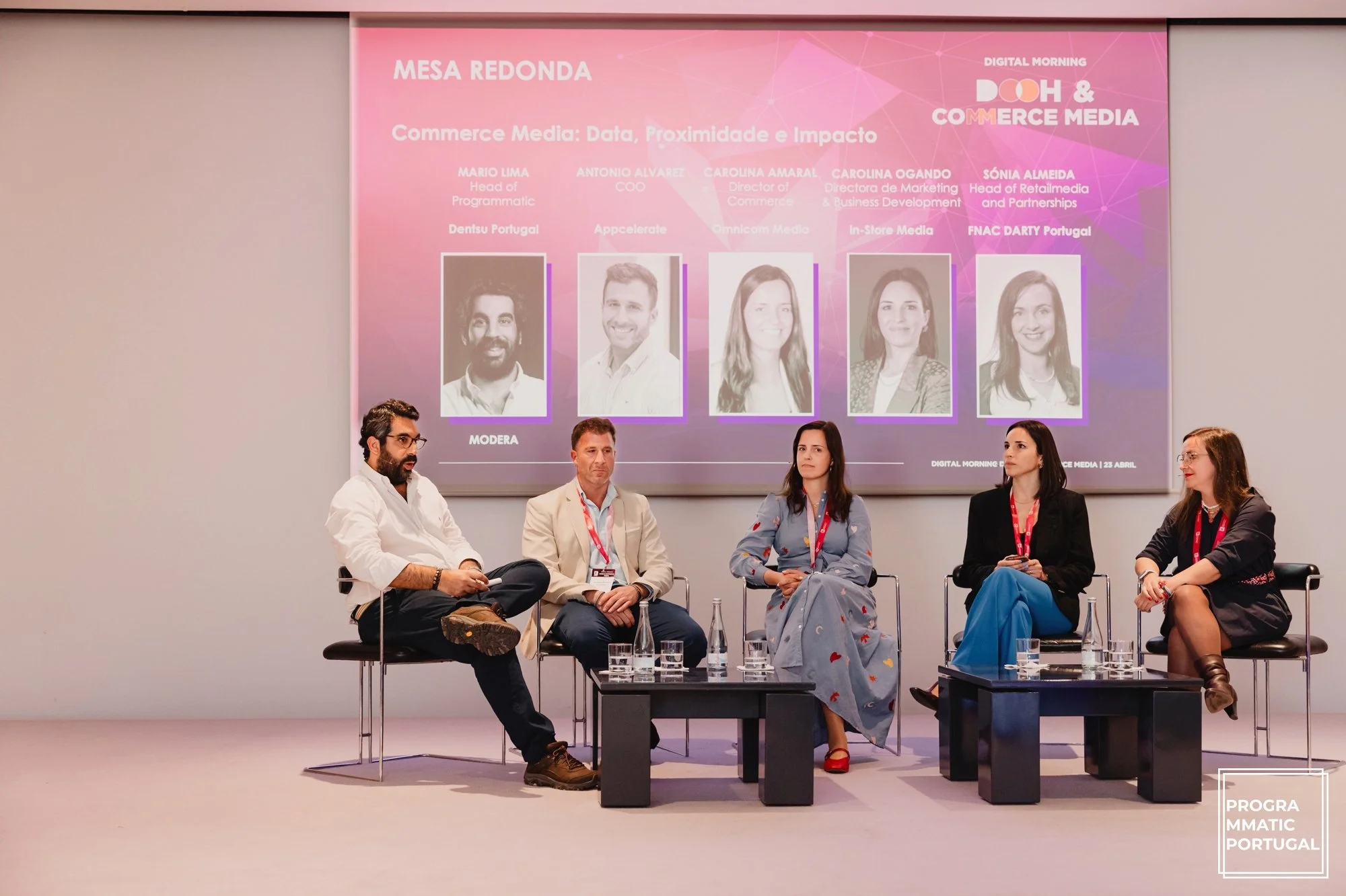 A mesa redonda moderada por Mario Lima contou com Carolina Amaral, Sónia Almeida, Carolina Ogando e Antonio Alvarez, explorando o conceito de commerce media como evolução estrutural do retail media e extensão do ecossistema de dados de consumo.