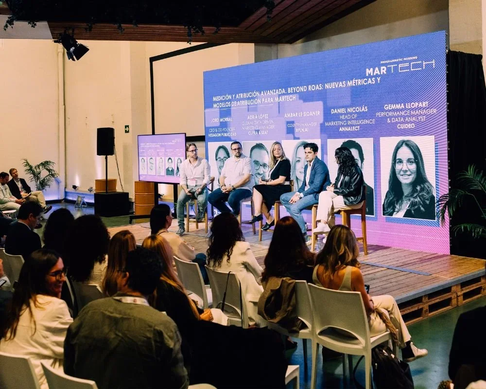 Na mesa dedicada à medição e atribuição, Adrià López, Global Data Driven Marketing Manager na CUPRA & SEAT; Ambar Le Sidaner, Country Manager da XPLN.ai; Daniel Nicolás, Head of Marketing Intelligence na Annalect, e Gemma Llopart, Performance Manager, CRO & Data Analyst na Cuideo, moderados por Jordi Morral, CEO e cofundador da Hexagon Publicidad, defenderam a necessidade de ir além do ROAS e incorporar outros KPIs, como a atenção publicitária, o CAC e o LTV.